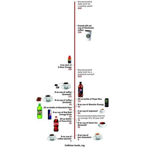 根据英国国民健康保险制度数据显示,一杯速溶咖啡含100毫克咖啡因,而一杯过滤式咖啡含140毫克咖啡因,一杯茶含75毫克咖啡因而一罐可乐含40毫克咖啡因。研究者发现,比起那些不喝咖啡因的,每天喝85~170毫克咖啡因的男性中,有42%无阳痿,而那些每天喝171~303毫克咖啡因的有39%无阳痿。
